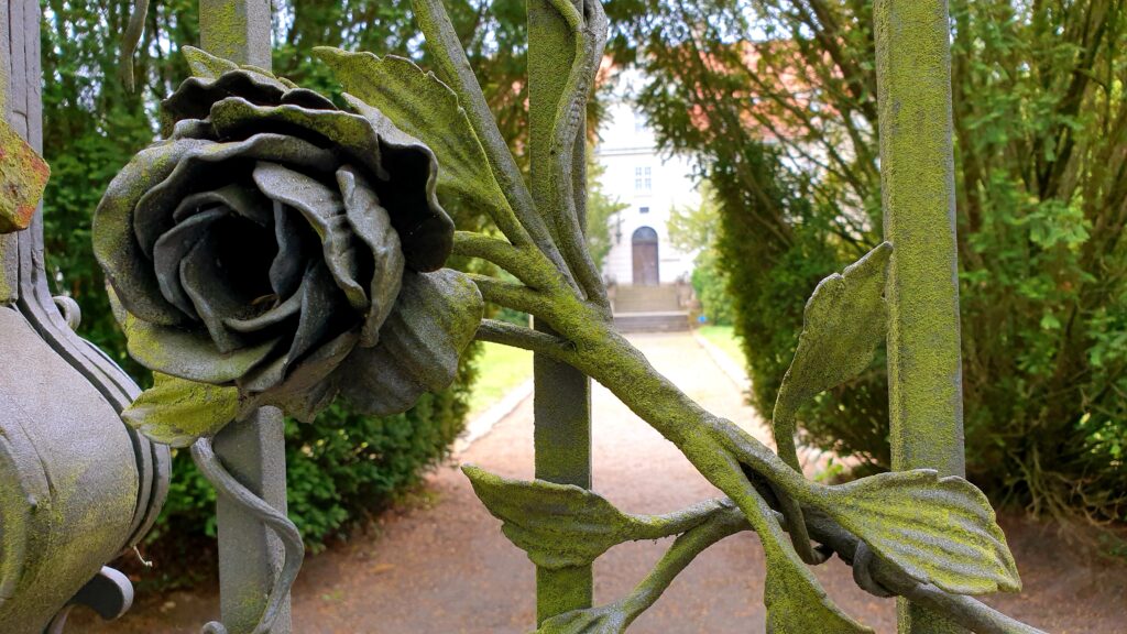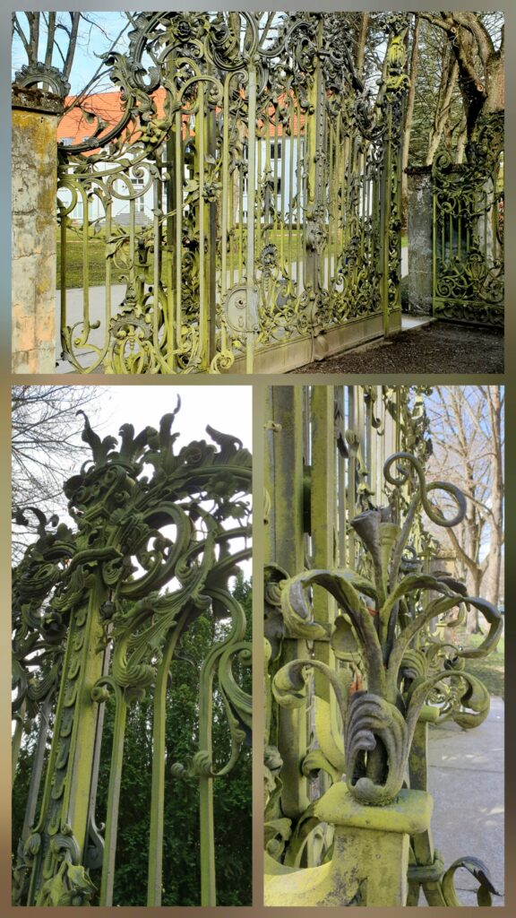1896. Ein Hauptschmuck des Parks ist ein großes Rokoko Thor von Schmiedeeisen, nach Lenchens Zeichnung entworfen. Dieses Tor schenkte sie ihrem Mann zum Geburtstag, da er selbst für solch ein Kunstwerk kein Geld ausgegeben hätte.