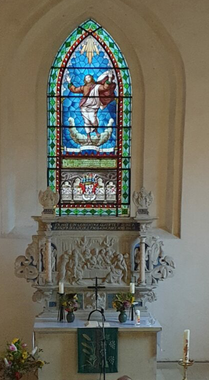 Die Glasmalerei im Ostfenster wurde 1890 nach einem Gemälde von Rafael „Verklärung Christi“ bei dem Berliner Königlichen Institut für Glasmalerei von der gräflichen Familie in Auftrag gegeben.