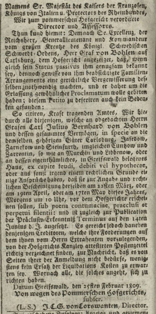 Im Februar 1809 erschien folgender Zeitungsartikel, der verdeutlicht, warum Carolines Vater beschloss, mit seiner Familie nach Pommern zu ziehen.