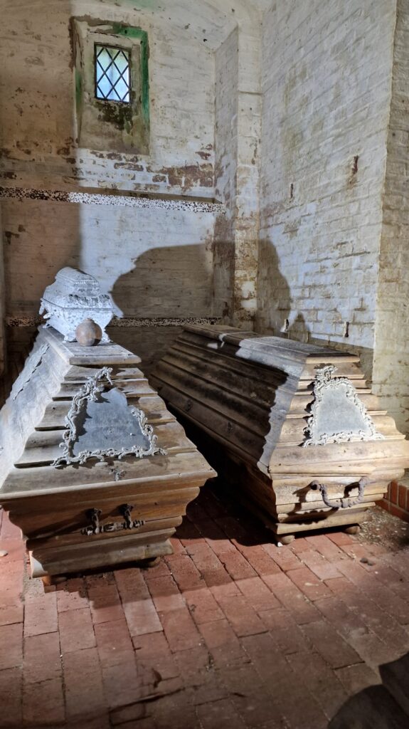 Auf der linken Seite stehen die Särge von Friedrich und Pauline. Der Kindersarg birgt wahrscheinlich einen totgeborenen Säugling, von dem Pauline 1870 in Karlsburg entbunden wurde. Rechterhand steht der Sarg von Carl.